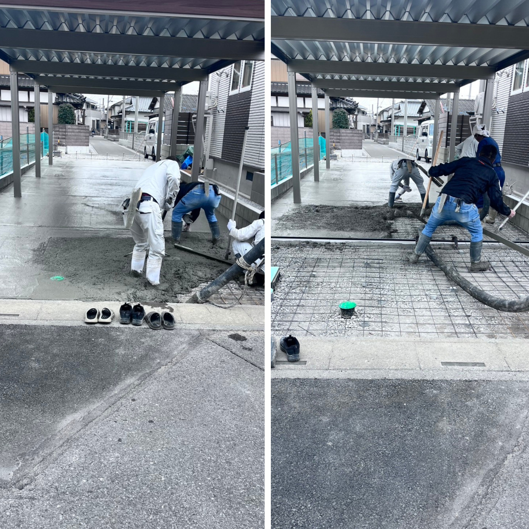 車庫の土間コンクリート、縦連棟のカーポート施工の様子